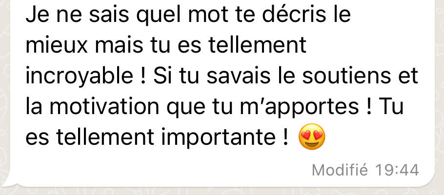Un suivi WhatsApp accessible du lundi au vendredi de 9h à 18h pour me poser toutes tes questions, m'envoyer tes contenus à l'avance, demander des conseils, etc...